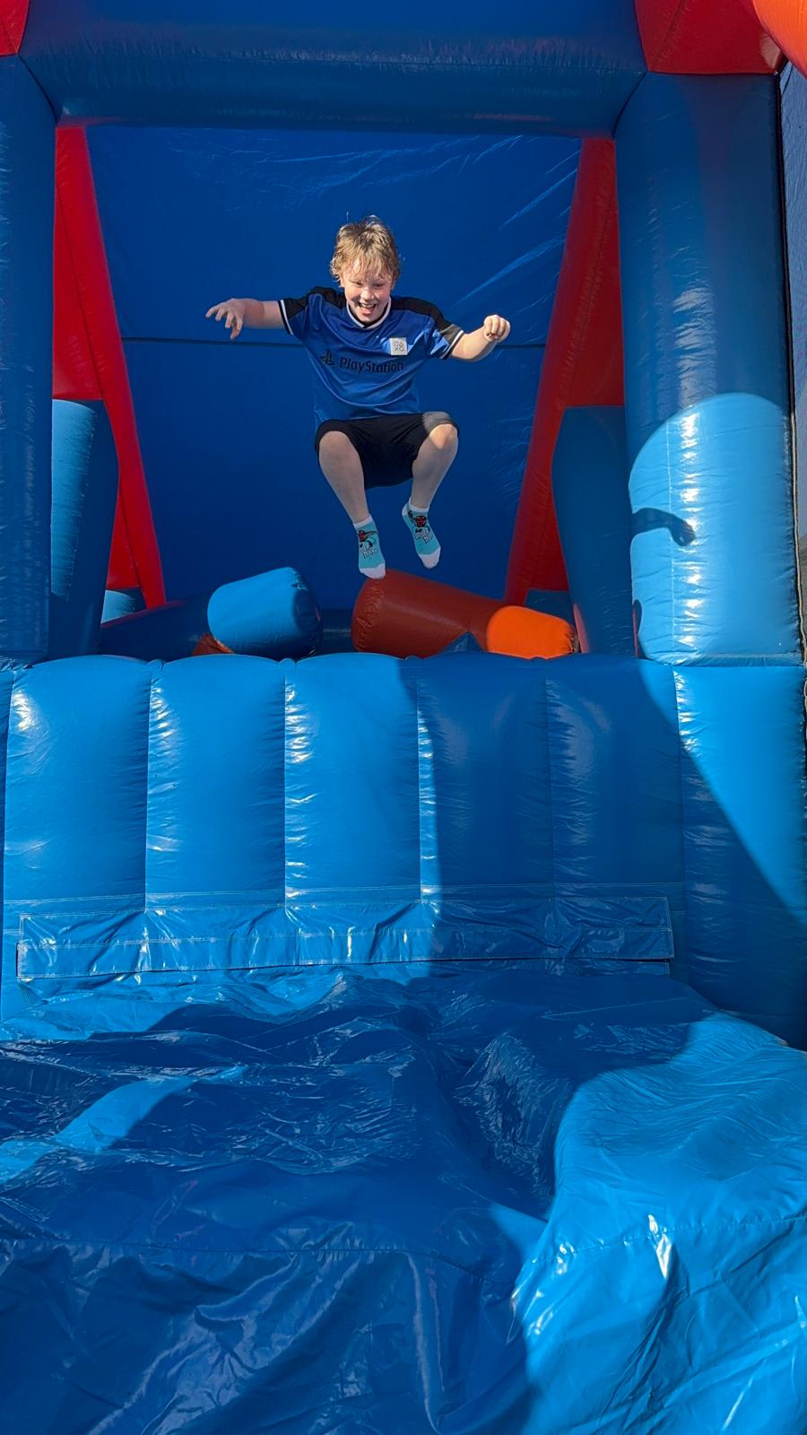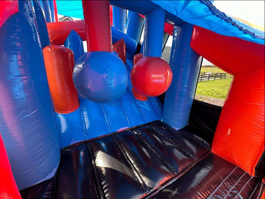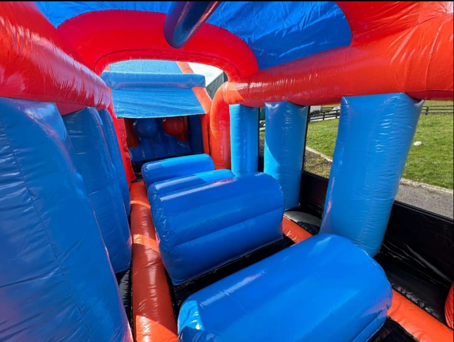 PLEASE NOTE: THERE IS NO SLIDE ON THIS OBSTACLE COURSE - INSTEAD YOU CLIMB TO THE TOP AND JUMP ON TO AN AIR FILLED MATTRESS